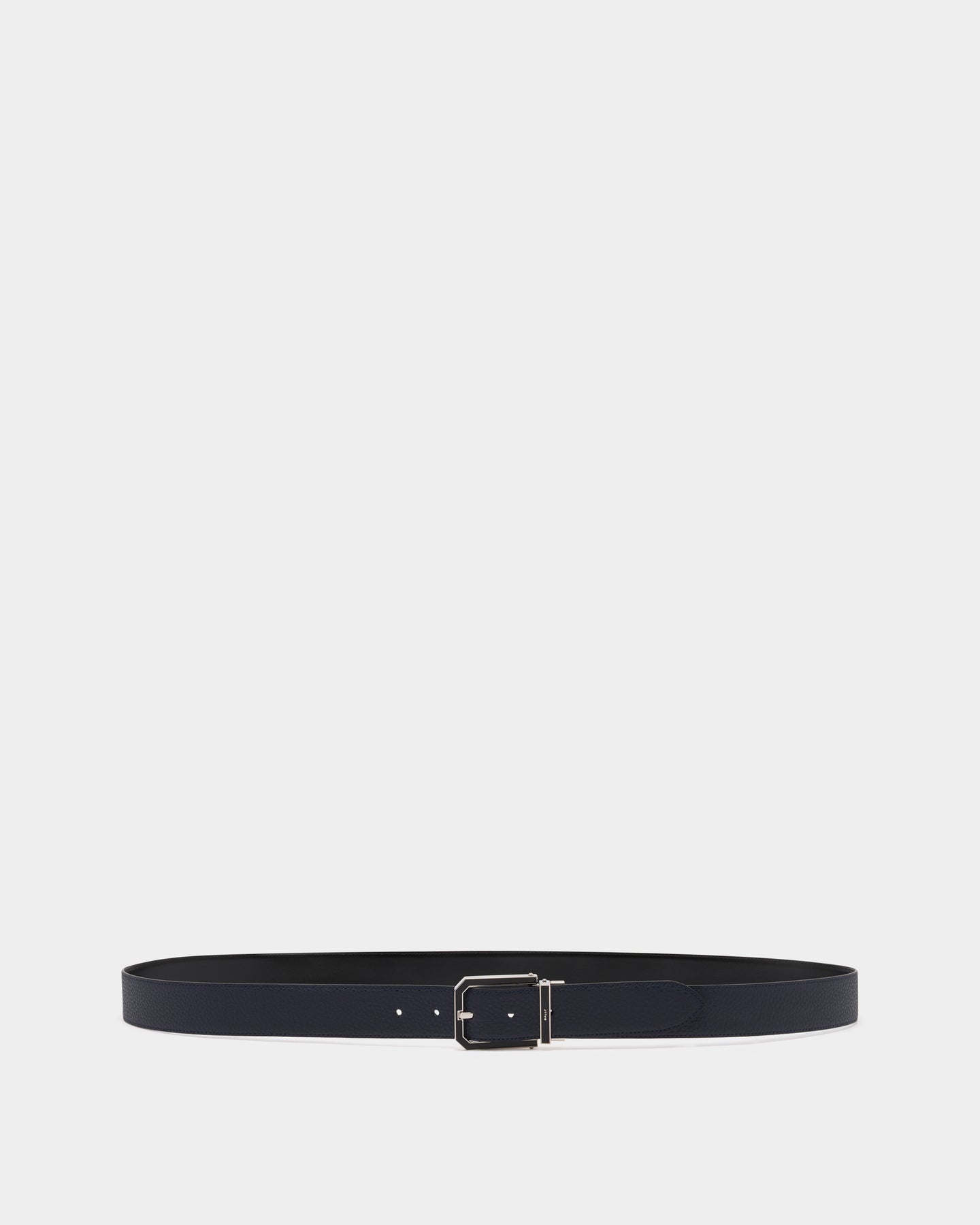 Beryl 可調式雙面皮帶以海軍藍與黑色皮革打造,一面為荔枝紋牛皮,另一面為光滑小牛皮,展現多變造型質感。配有銀白色金屬與琺瑯框形扣頭,刻有 Bally 標誌,體現品牌低調奢華的美學語彙。
