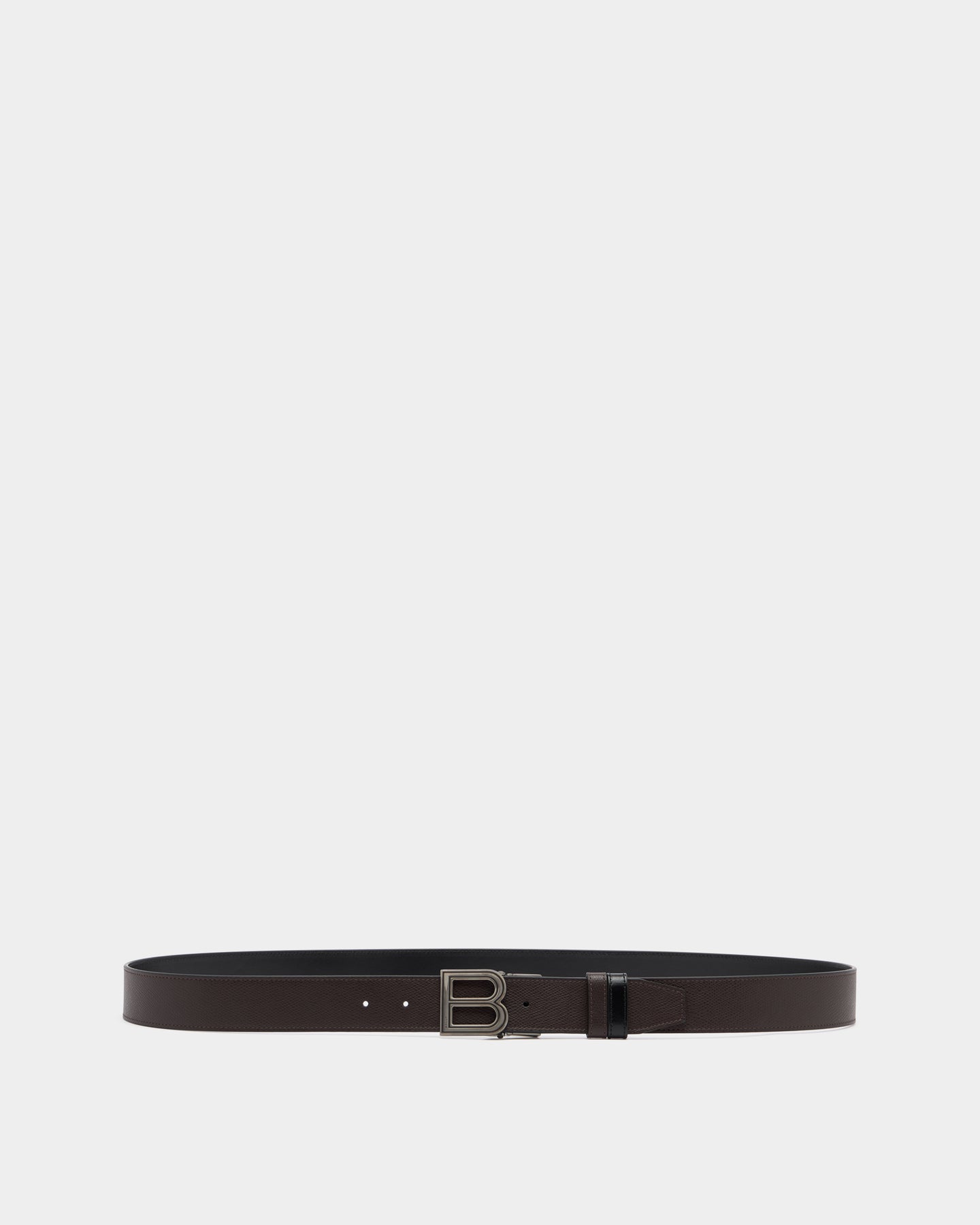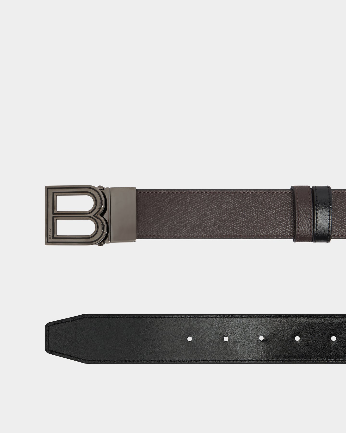 此款 B Logo 皮帶以俐落的金屬 Bally B 扣頭為設計亮點,採用深棕色荔枝紋皮革與黑色光滑皮革的雙面設計,展現百搭且現代的風格。銣灰色金屬質感扣頭為整體造型增添低調精緻的奢華氣息。
