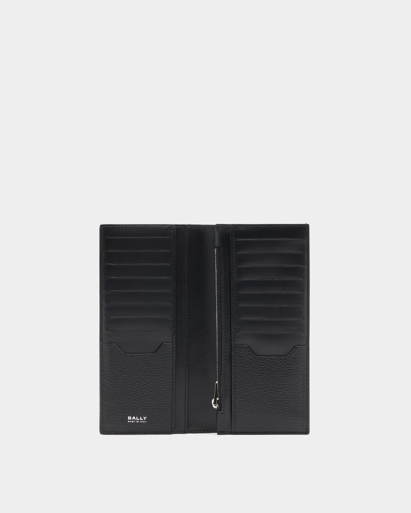 此款 Capitol 長夾以黑色粒面小牛皮打造,展現沉穩且經典的質感風格。外觀與內部皆點綴 Bally 金屬箔 logo,低調彰顯品牌識別。大容量設計提供完整收納空間,輕鬆整理卡片與現金,是日常與商務場合皆適用的實用單品。