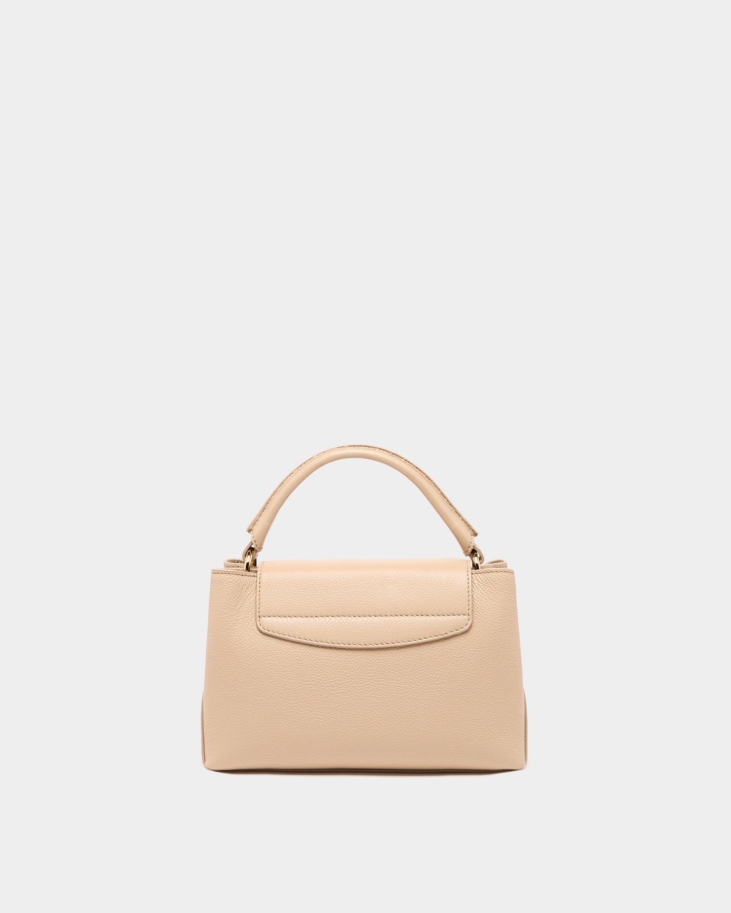 以米色顆粒感小牛皮精緻製作,結構線條俐落,展現幾何輪廓的現代感。翻蓋中央飾以金色金屬釦飾,細節刻字增添辨識度與質感。寬版提把與皮革肩背帶設計,提供手提與肩背多種攜帶方式,兼具優雅比例與日常實用性。