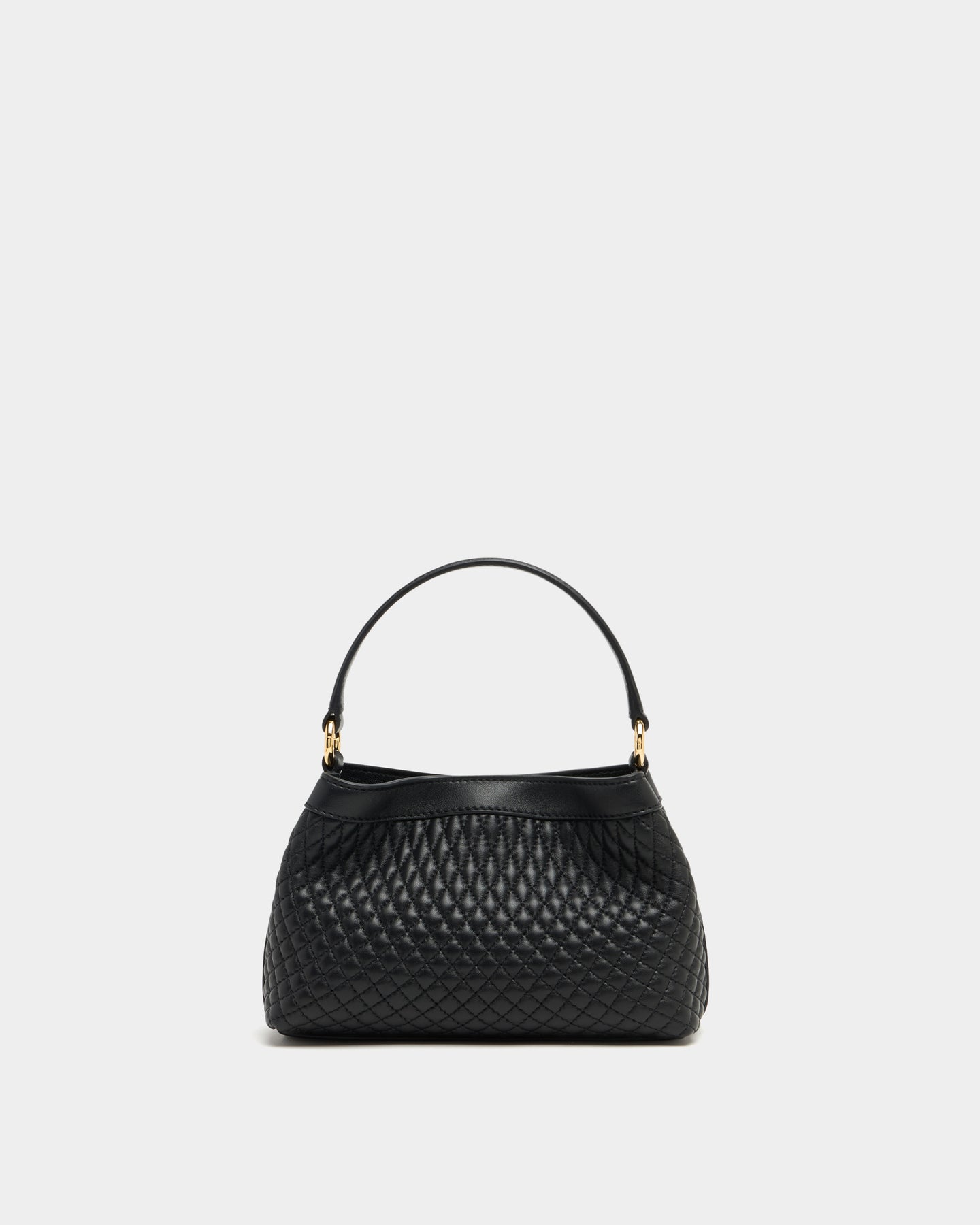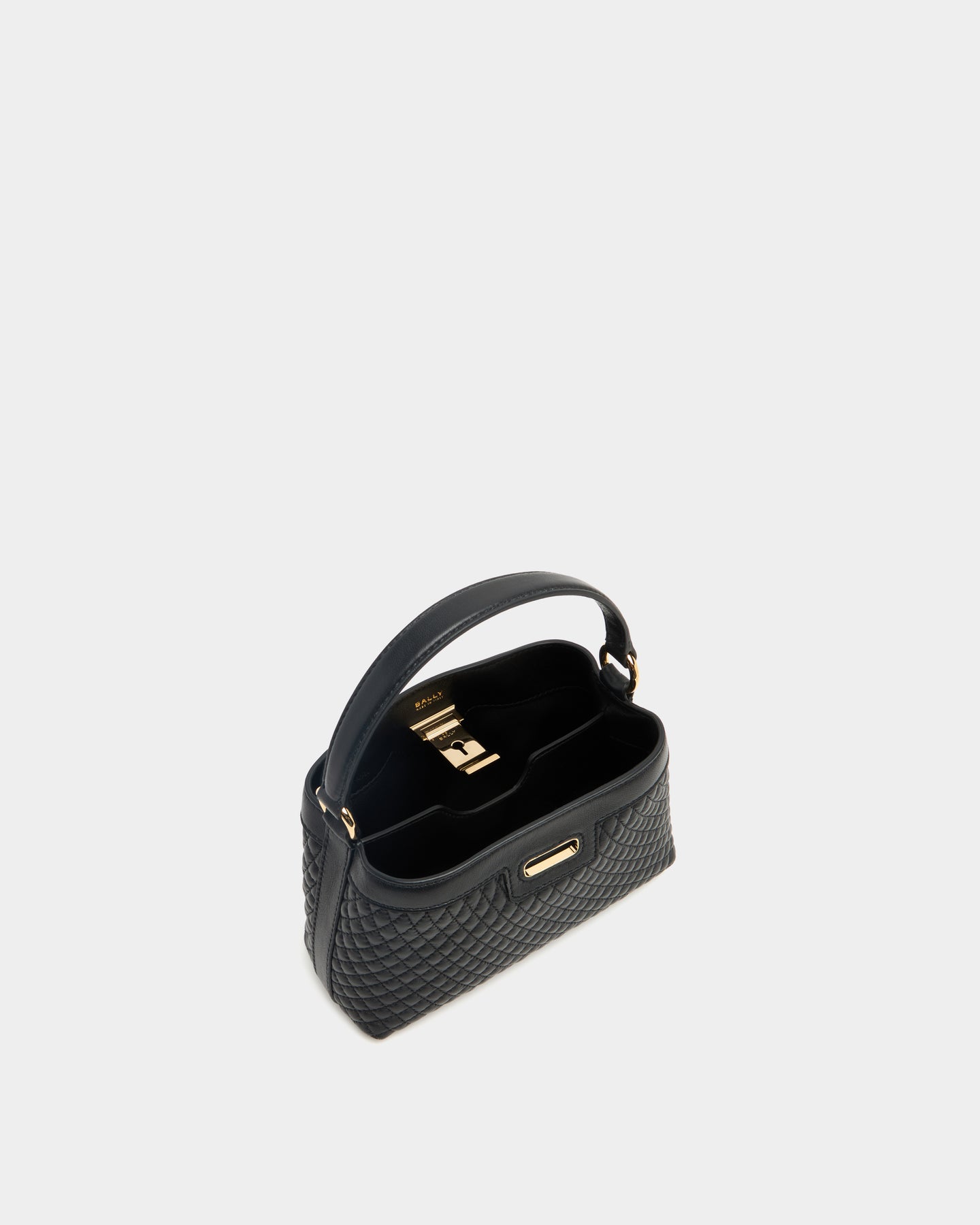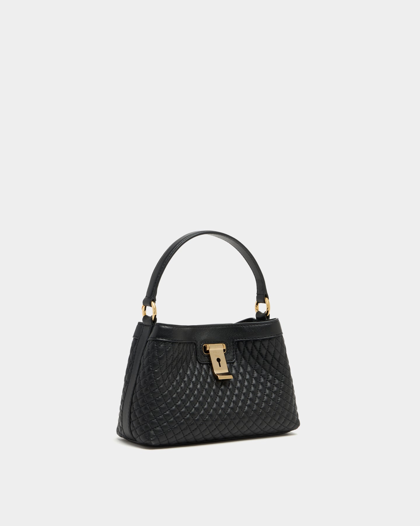 Lock Me 迷你包以細緻絎縫小羊皮重新詮釋,包身線條柔和卻不失結構感。正面飾有刻印 Bally 標誌的 Lock Me 金屬扣件,成為經典識別焦點。搭配金色鍊帶與皮革拼接背帶,可肩背或斜背使用,比例精巧,適合日常外出或晚間場合,展現低調而精緻的風格。