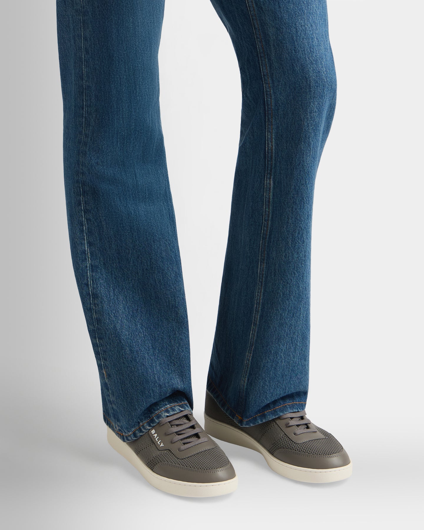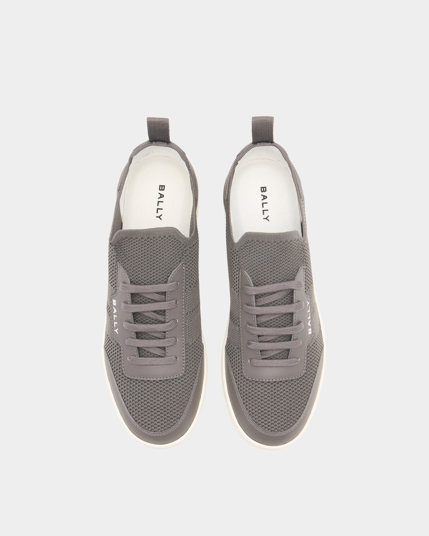 此款 Tennis 一腳蹬運動鞋以灰色針織紗線於鞋楦上成型製作,並搭配同色系皮革細節加強結構。鞋側於品牌標誌與裝飾性鞋帶下方繡有經典 Bally 緞帶元素,展現簡約俐落且富有設計感的現代風格。
