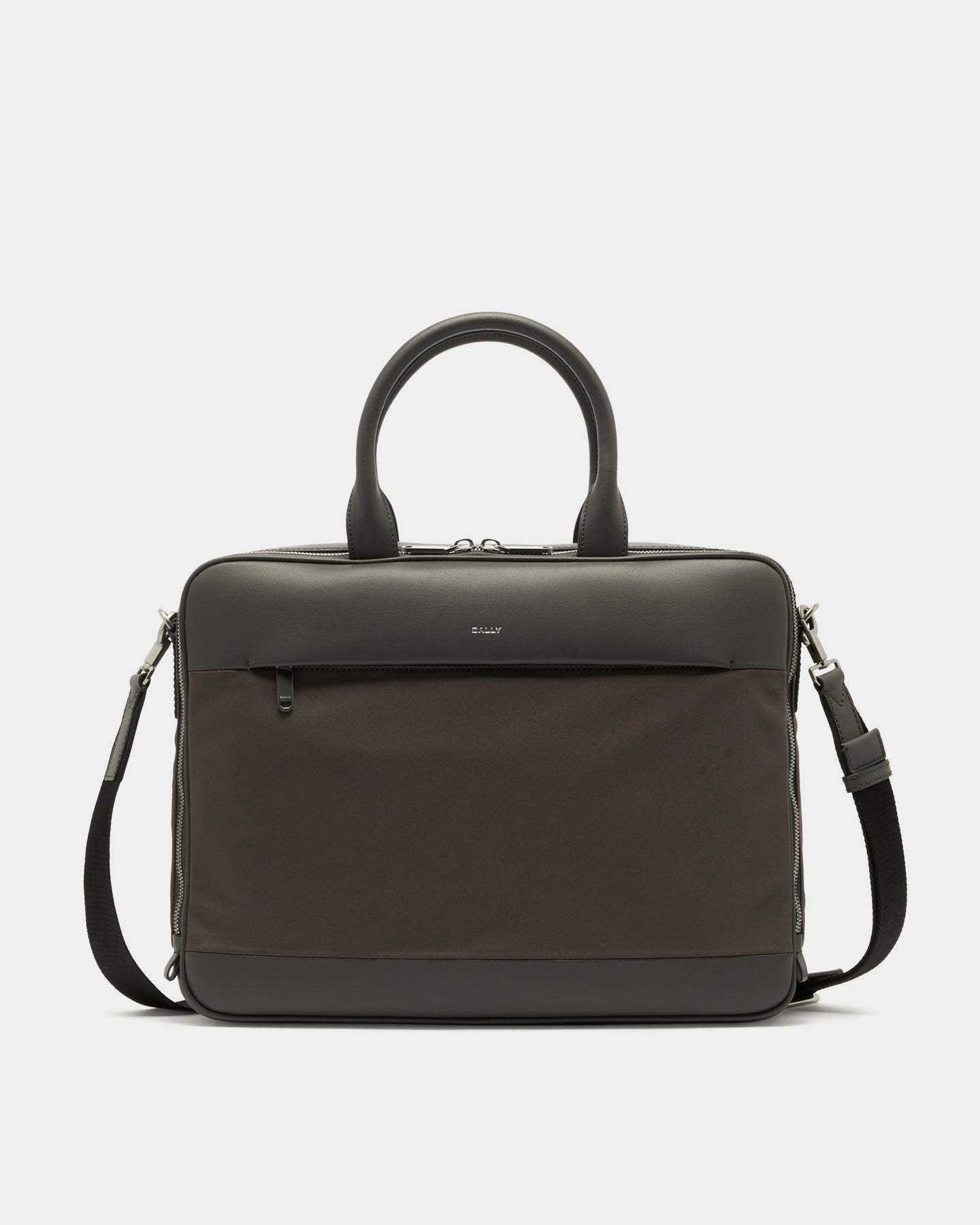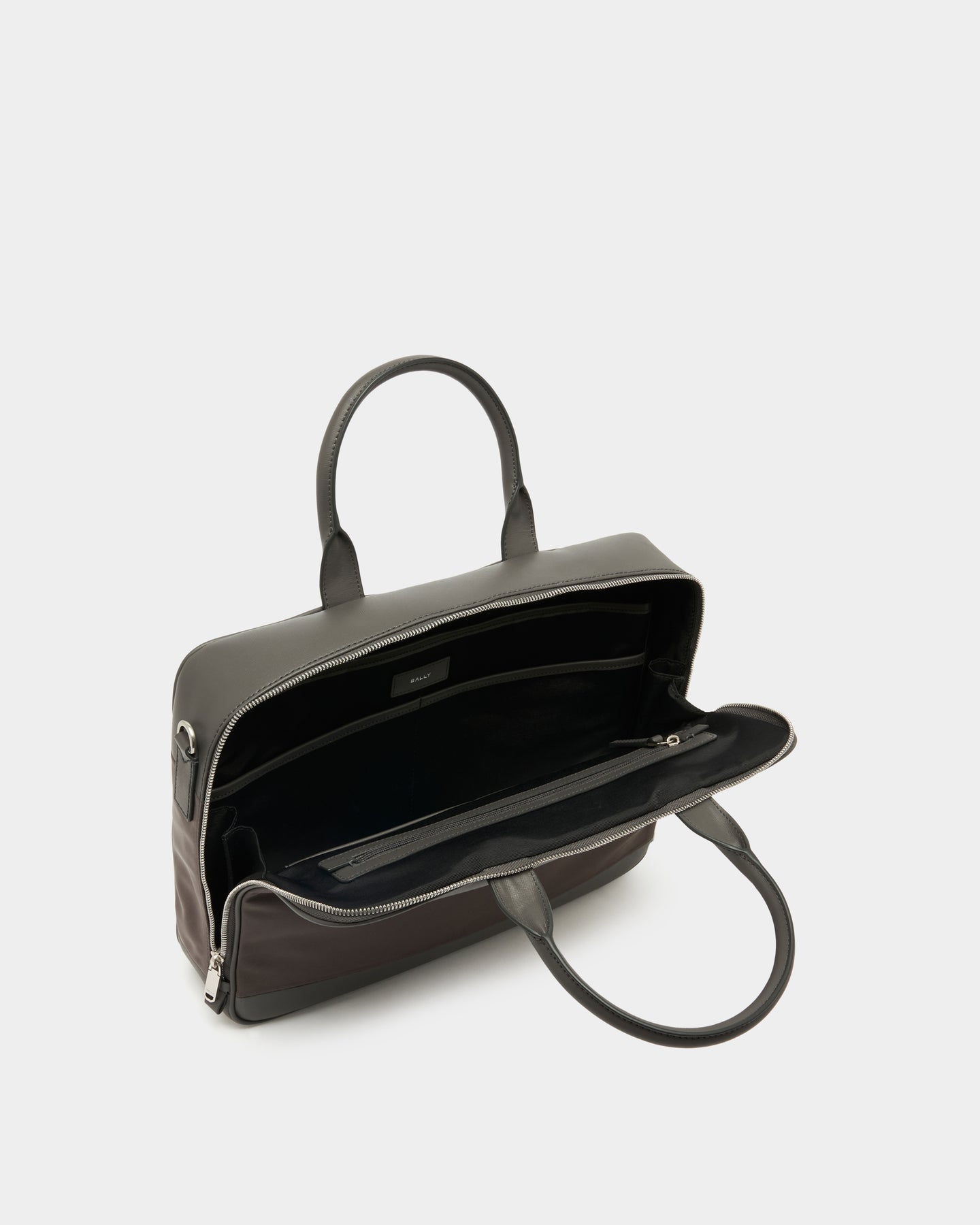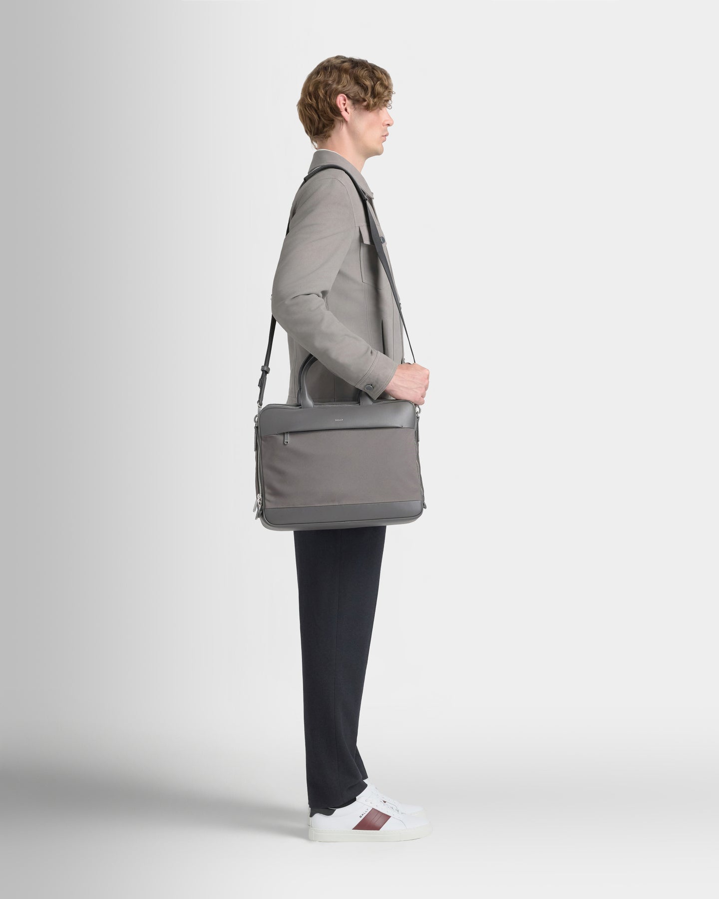 以灰色尼龍結合再生牛皮製作,外型俐落且結構清晰,專為高效率的日常通勤與差旅需求而設計。雙隔層配置讓收納更加有序,可妥善放置筆電與各式隨身物品。手提把、可調式肩背帶與背面行李箱固定套帶,提供多元攜帶方式,兼顧實用性與行動便利性。