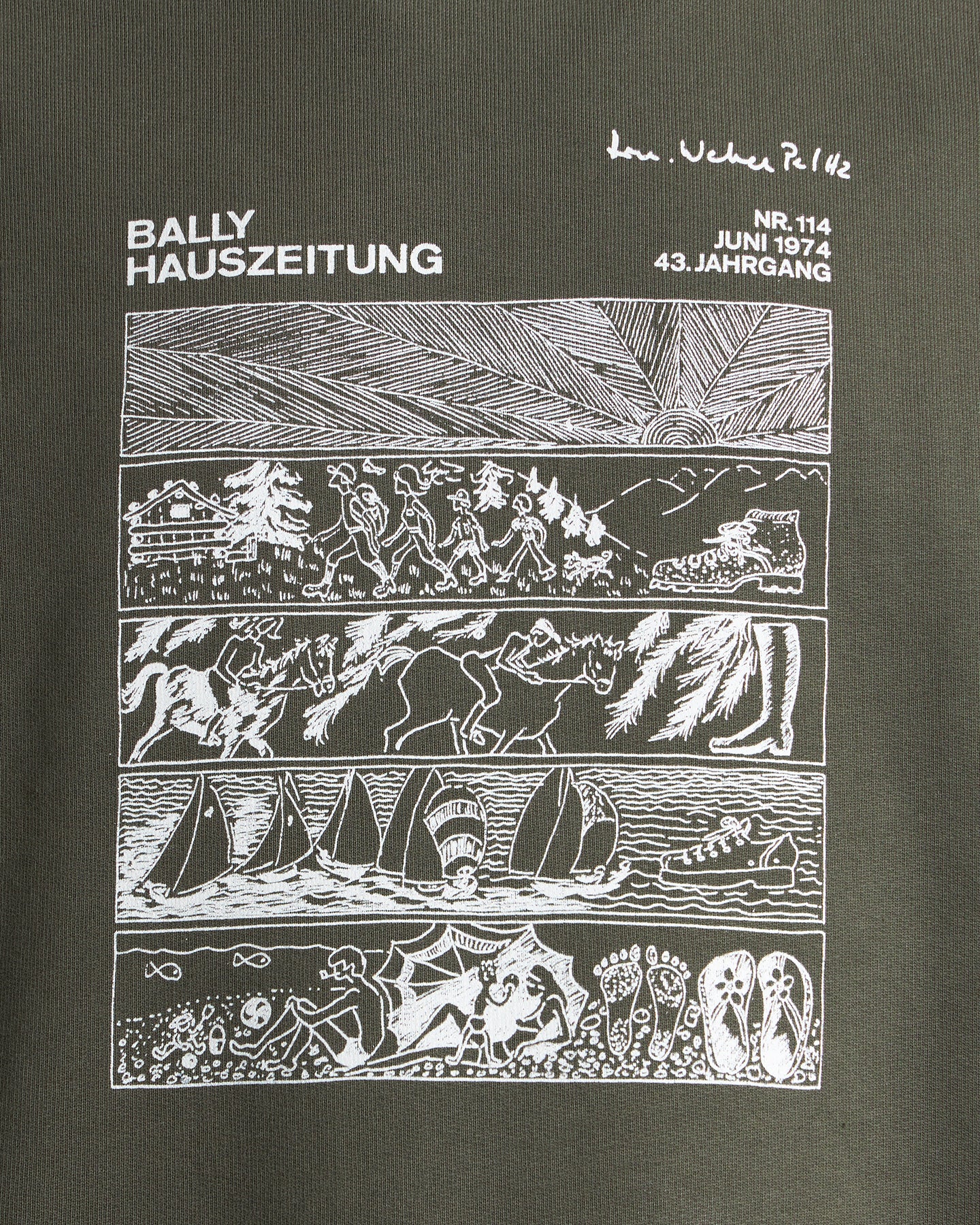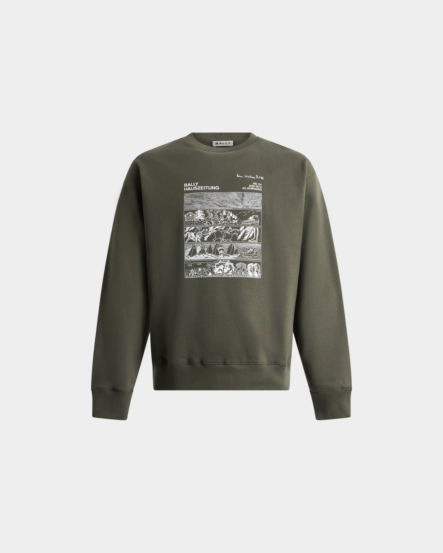 此款圓領上衣以軍綠色有機棉製作,整體風格低調而富有個性。正面刺繡圖案取材自 Bally 報紙典藏中的漫畫元素,為簡潔輪廓注入趣味與品牌故事性。內側經刷毛處理,穿著時帶來柔軟且保暖的觸感,適合秋冬季節日常著用。