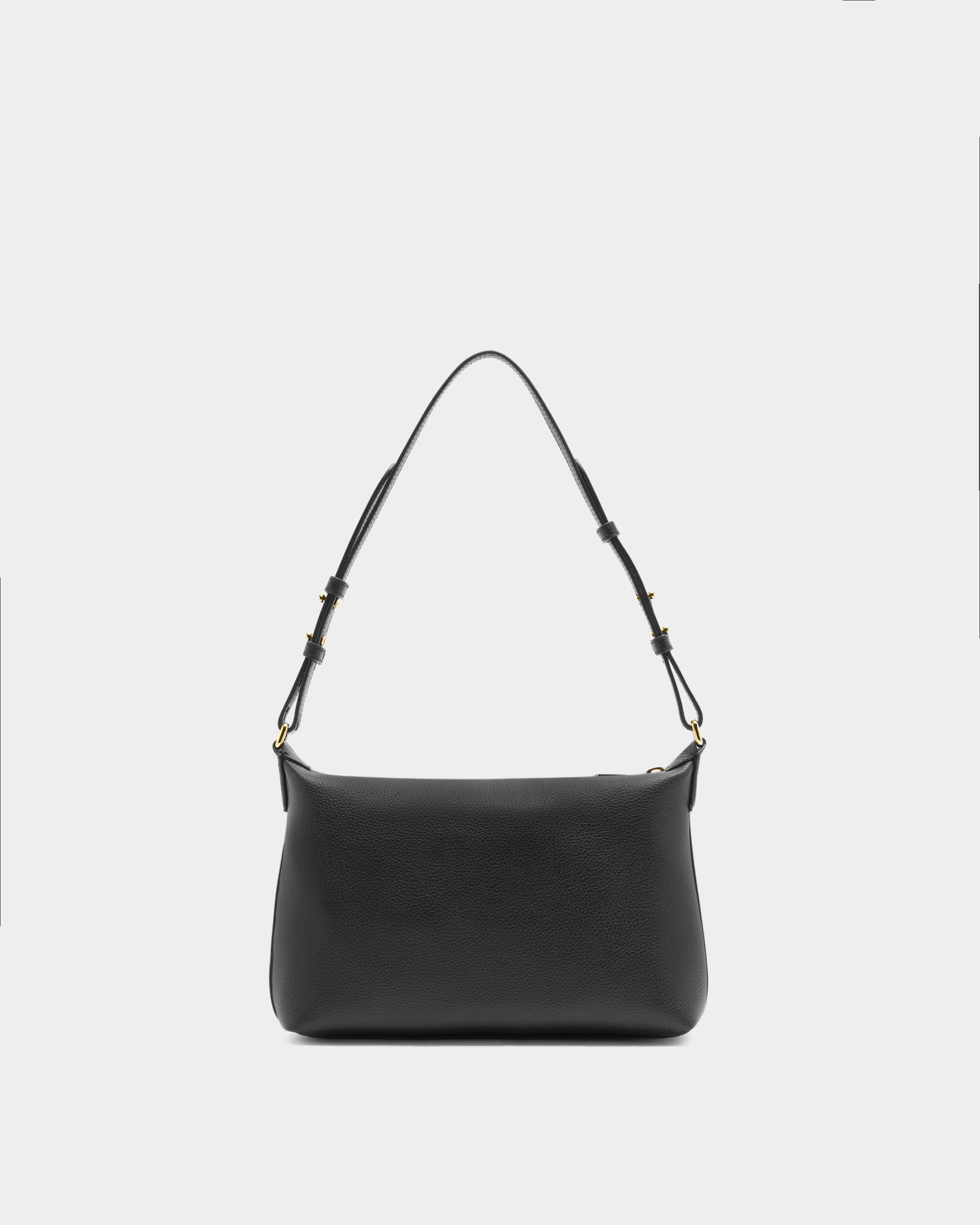 以黑色顆粒感牛皮打造,包身線條流暢自然,呈現輕鬆而優雅的日常風格。正面燙印徽章細節低調點綴,增添精緻質感。隨附兩款背帶設計,可依需求切換斜背或肩背方式,兼具造型靈活度與實用性,是日常外出與通勤的理想選擇。